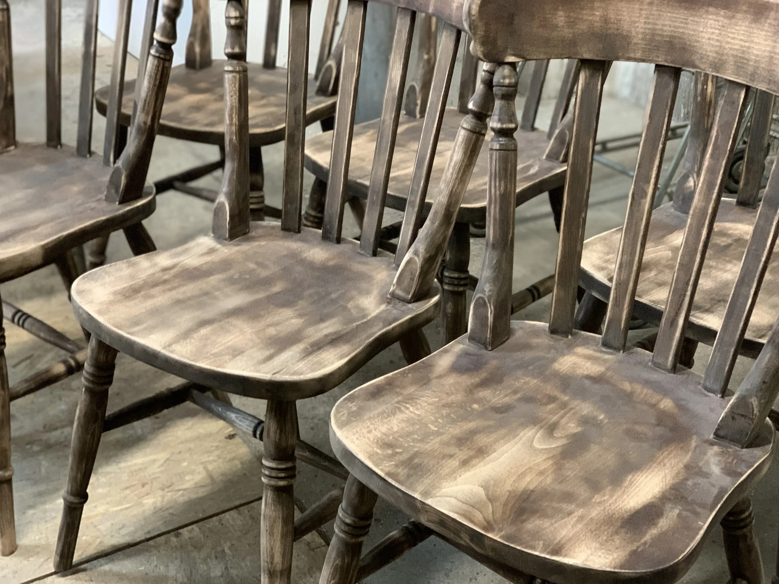 Wooden chairs sanded down to look old and worn, with a paint wash and glaze added.