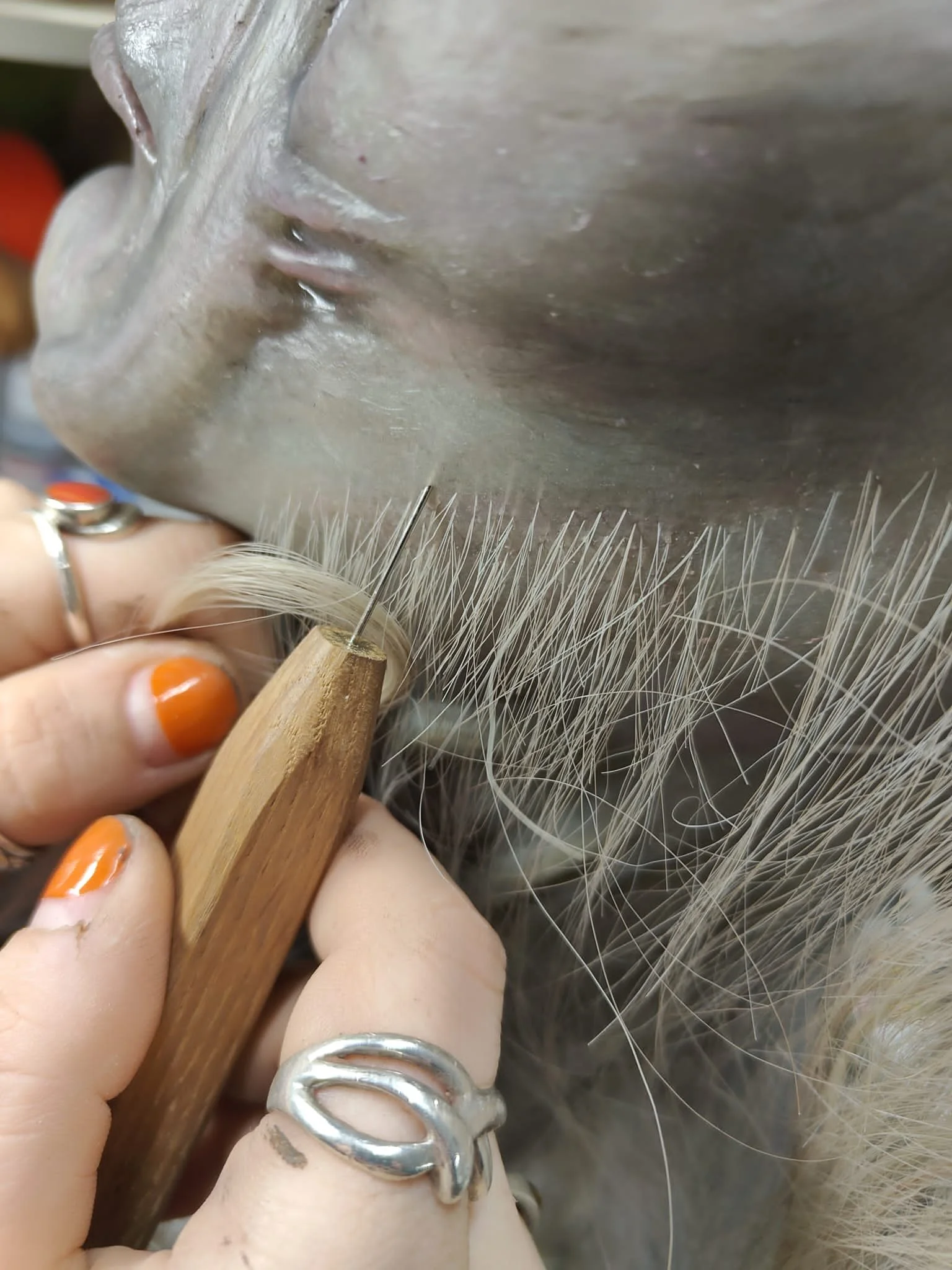 Painted with silicone and hair punched. 3D printed animatronic eyes, coded Arduino board, operated by joystick.